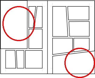 これには、ページの中でメリハリを付けるということと、ビジュアル的な見所をページ単位に作って、読者を飽きさせないという役割があります。読者が最後まで読むための小さな努力です。これらをきちんと守ることにより、メリハリの利いた画面作りの基礎ができます。コマ割りの基本は、『見せたいコマを大きくする』です。